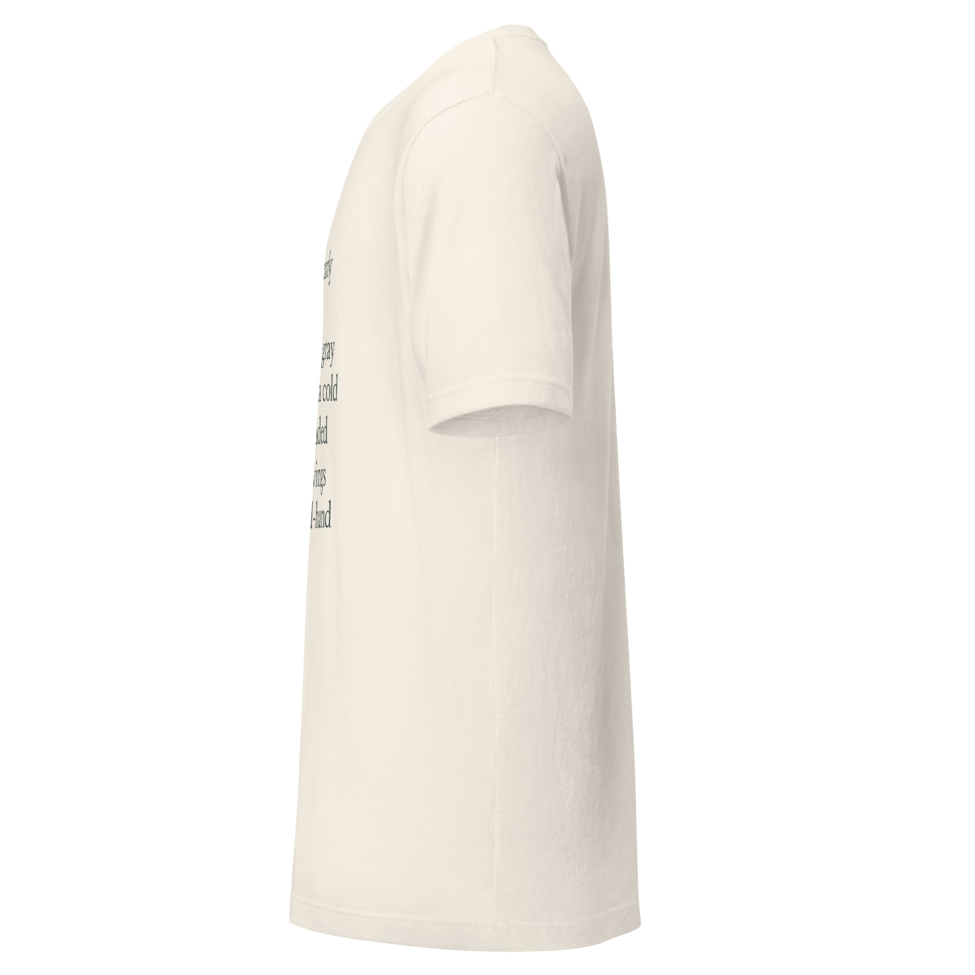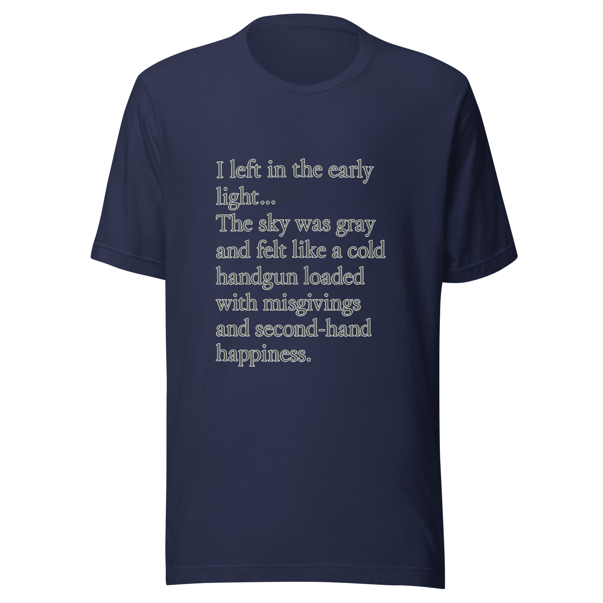 Unisex t-shirt – “left in the early light… The sky was gray and felt like a cold handgun loaded with misgivings and second-hand happiness.”