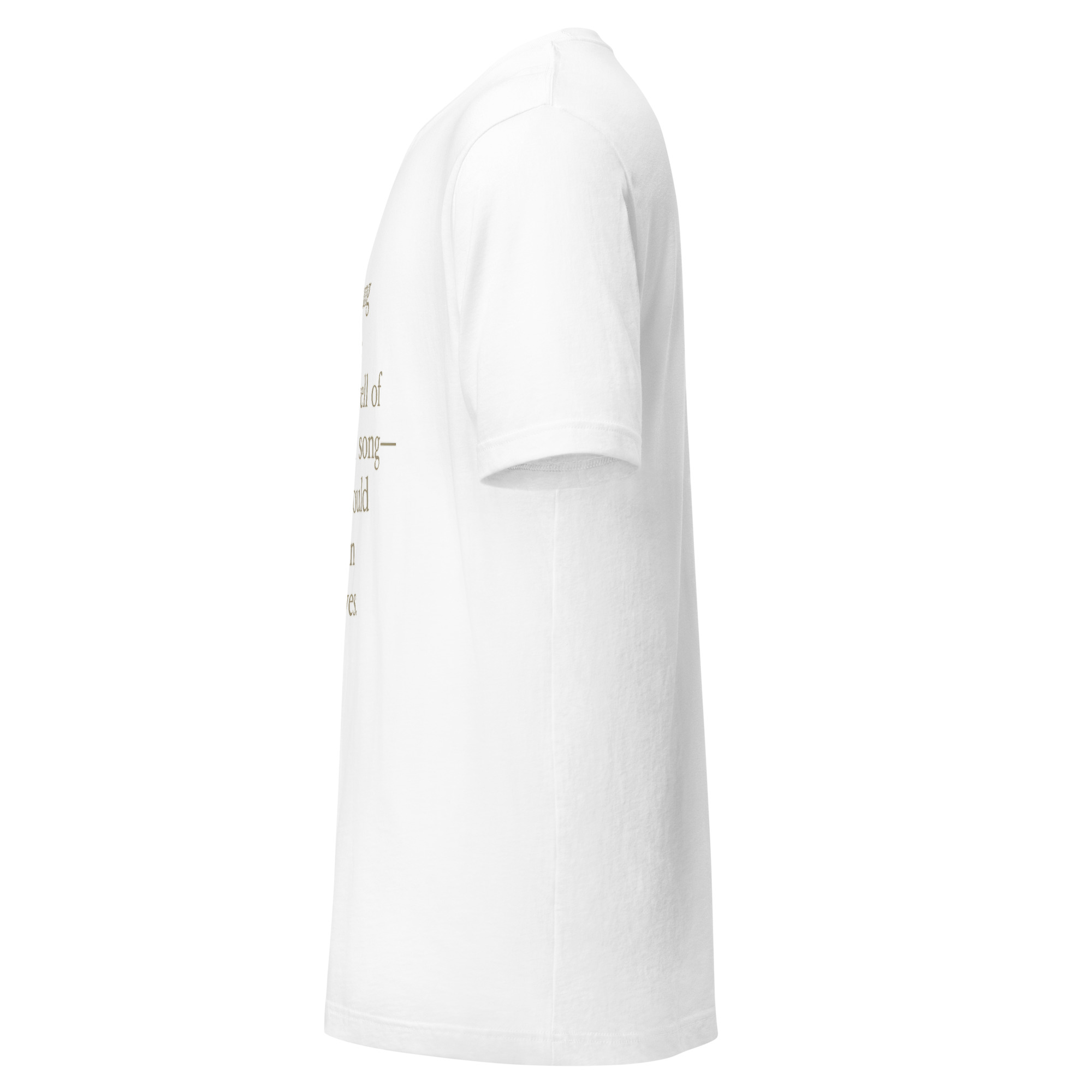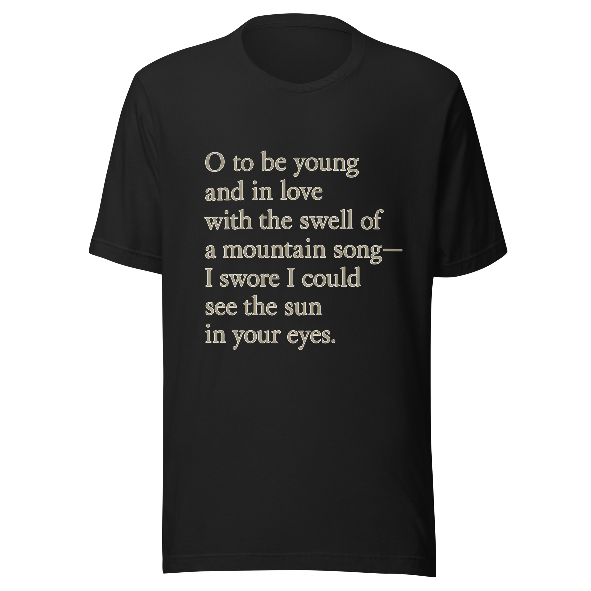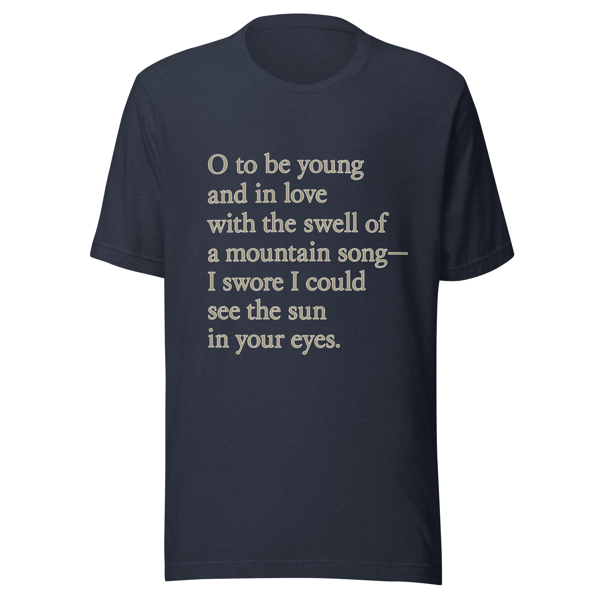 Unisex t-shirt – “O to be young and in love with the swell of a mountain song— I swore I could see the sun in your eyes.”
